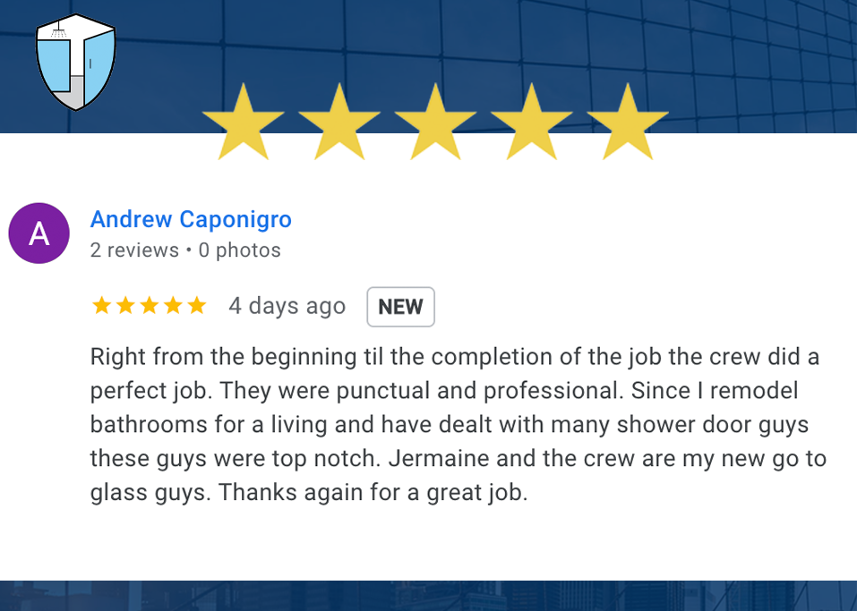 From the standard “door and panel” shower to gym steam rooms and office conference glass partitions, Jermaine and his team show up not just to provide you with the quality you expect but the goal of earning your referral business.